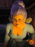 The Fairy Godmother appears when Shrek and his friends go to her potion shop. Shrek asks the Fairy Godmother for a potion and turn into a human to please Fiona but she refused and tells him and his friends to leave. She later fights little red riding hood in her potion shop and loses. She later captures Snow White and escapes. Shrek and Donkey then catch up to her and successfully get Snow White. Shen later fights Shrek and his friends at the ball and turns King Harold into a frog. The fairy godmother then unleashes trolls to fight Shrek and his friends. When Shrek and his friends defeat the trolls, they fight against the Fairy Godmother, then after a long fight, she was finally defeated and vanished away.