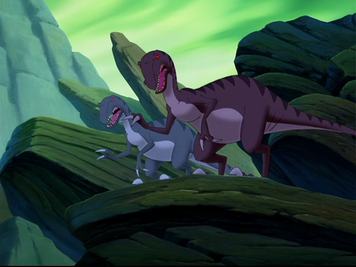 The Fast Biters head to the Great Valley by getting through a hole in a large pile of rocks. They then scurry into the brush and jumps out to chase Cera and the rest of Littlefoot's friends while Tria headbutts the blue Fast Biter aside to defend Cera. They continue chase the five and the purple Fast Biter gets hit by Littlefoot to save Ducky who pulling back a tree branch, but it quickly recovers and chases both of them. The blue Fast Biter is about to eat Spike and Petrie before he gets tickled by Lizzie and Skitter.